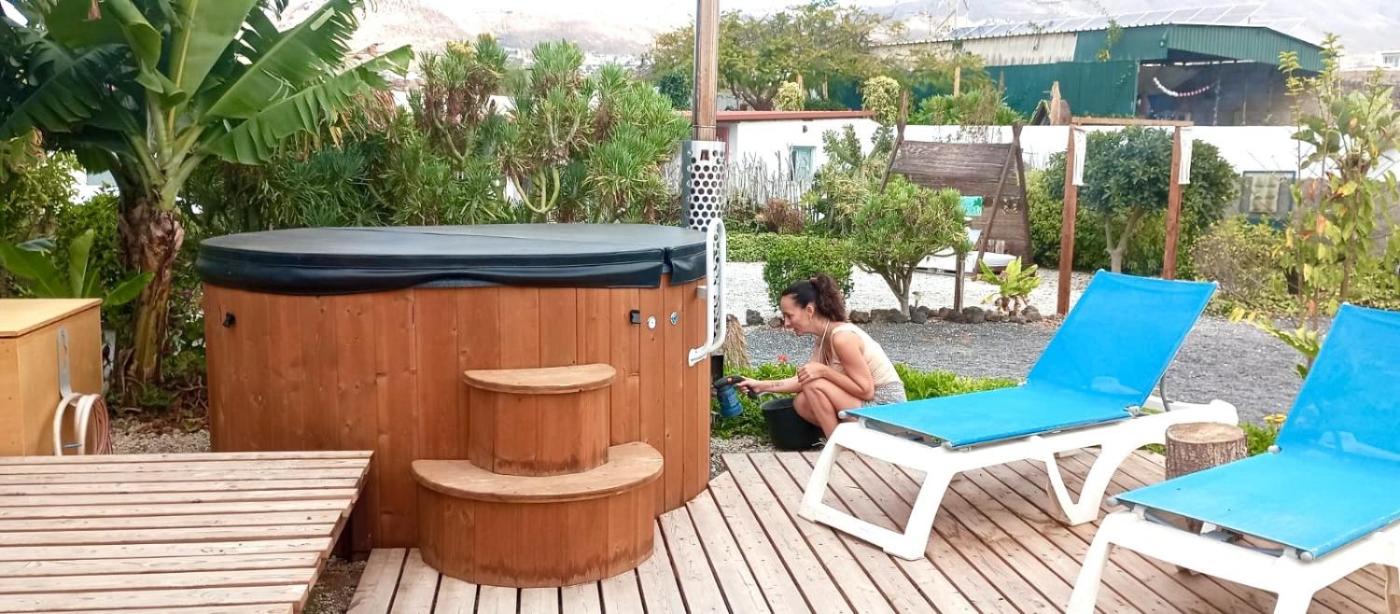 It is a wooden house with a sauna and private Jacuzzi, with access to the common areas of the pool, kitchen, yoga area and barbecue.