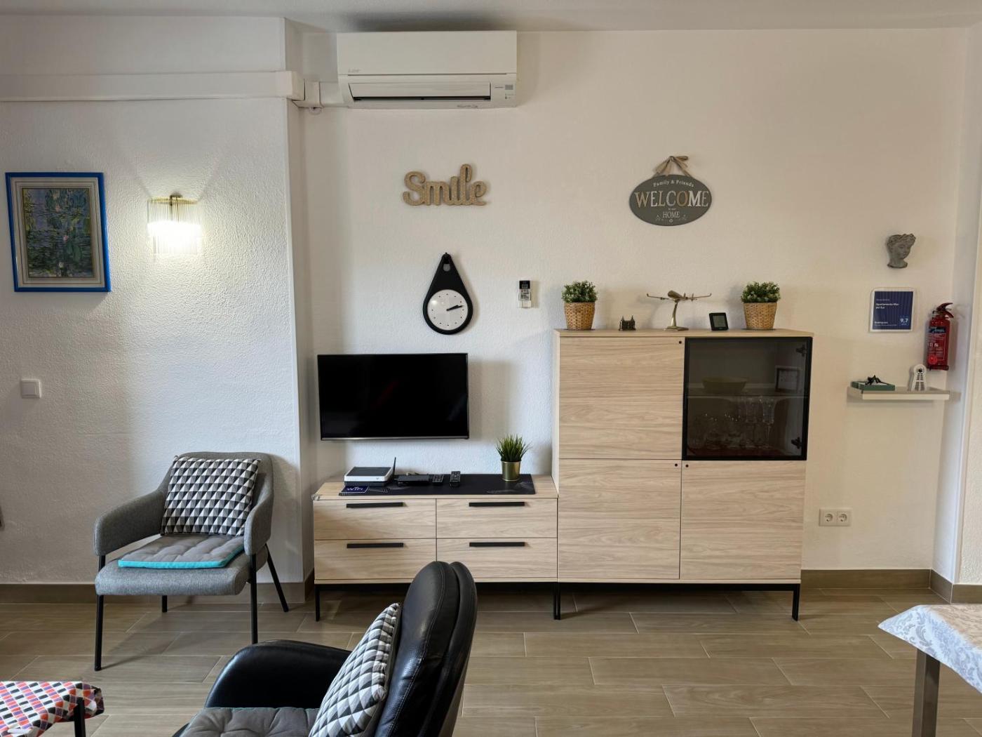 Two-Bedroom Apartment. Featuring two terraces, this apartment has a double bedroom, a bedroom with bunk beds for 2 people, and a bathroom with a bath and free toiletries. The living room includes a flat-screen TV, sofa and dining table, while the kitchen is equipped with a washing machine, ceramic hob, microwave, toaster and coffee maker. Free WiFi is available throughout. free bed linen and towels